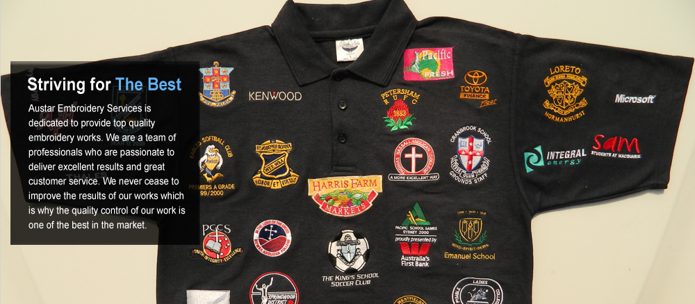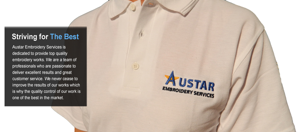 Austar Embroidery Services is dedicated to provide top quality embroidery works. We are a team of professionals who are passionate to deliver excellent results and great customer service.